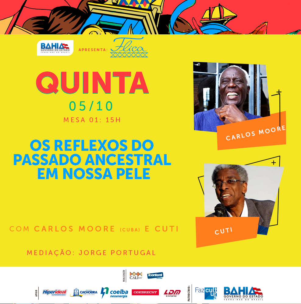 Dois nomes com trajetórias gigantescas numa mesa de abertura. Duas referências sempre consultadas, não importa a direção que se tome, envolvendo complexa teia de dissidências e busca de identidade, embate e desterro, capitulação e resistência. Um recorte no tempo para debater a negritude como protagonista numa sociedade em sua face mais excludente. Carlos Moore nasceu em Cuba, mas se sente um cidadão exilado que precisa se reinventar onde quer que esteja, para quem fugir foi a coisa mais poderosa de sua infância. Por sua vez, Cuti (pseudônimo de Luiz Silva), nascido no interior de São Paulo, é uma das figuras mais destacadas da literatura do país, fundador de movimentos e publicações icônicas como o Cadernos Negros. Na condição de mediador, Jorge Portugal, outro nome referencial que está presente desde as primeiras edições da Flica.