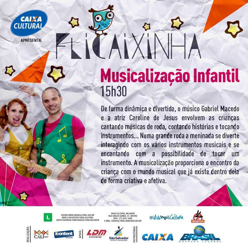 A 1ª edição da FliCaixa, Festa Literária da Caixa, começou na cidade de Salvador, Bahia, no sábado, 29 de abril de 2017, no belo casarão histórico da Caixa Cultural baiana, com a realização das produtoras Cali e Icontent, e patrocínio da Caixa e Governo Federal.